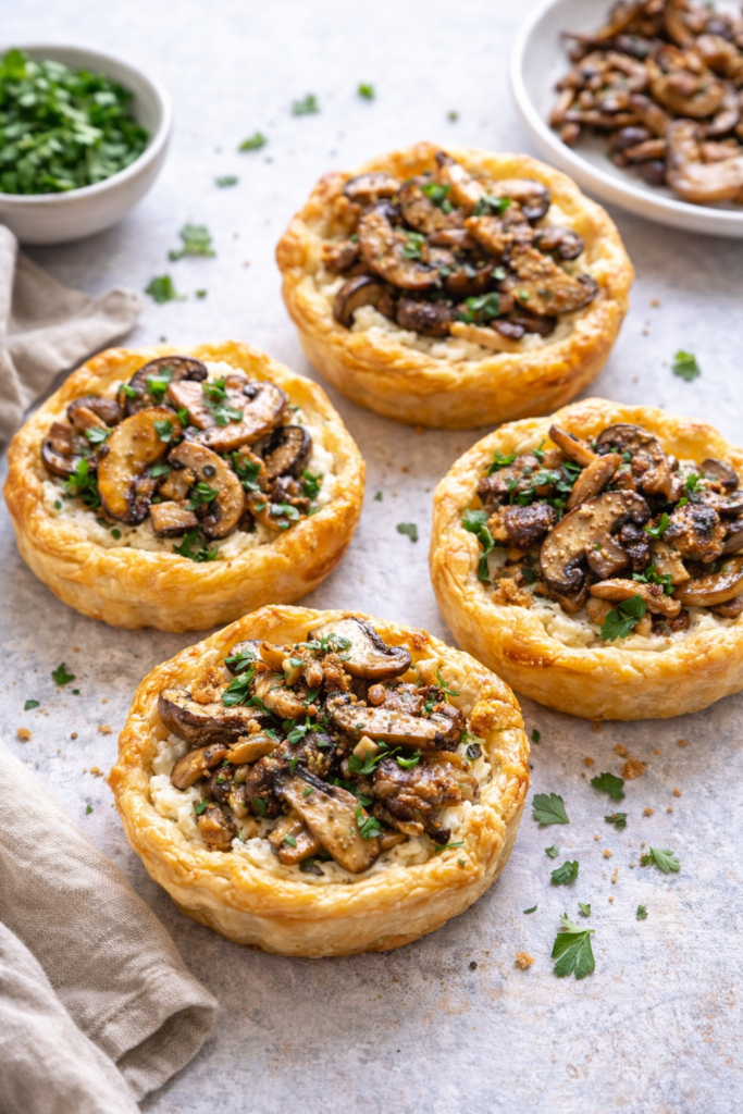• Vul elk bladerdeegrondje met een lepeltje paddenstoelenmengsel.