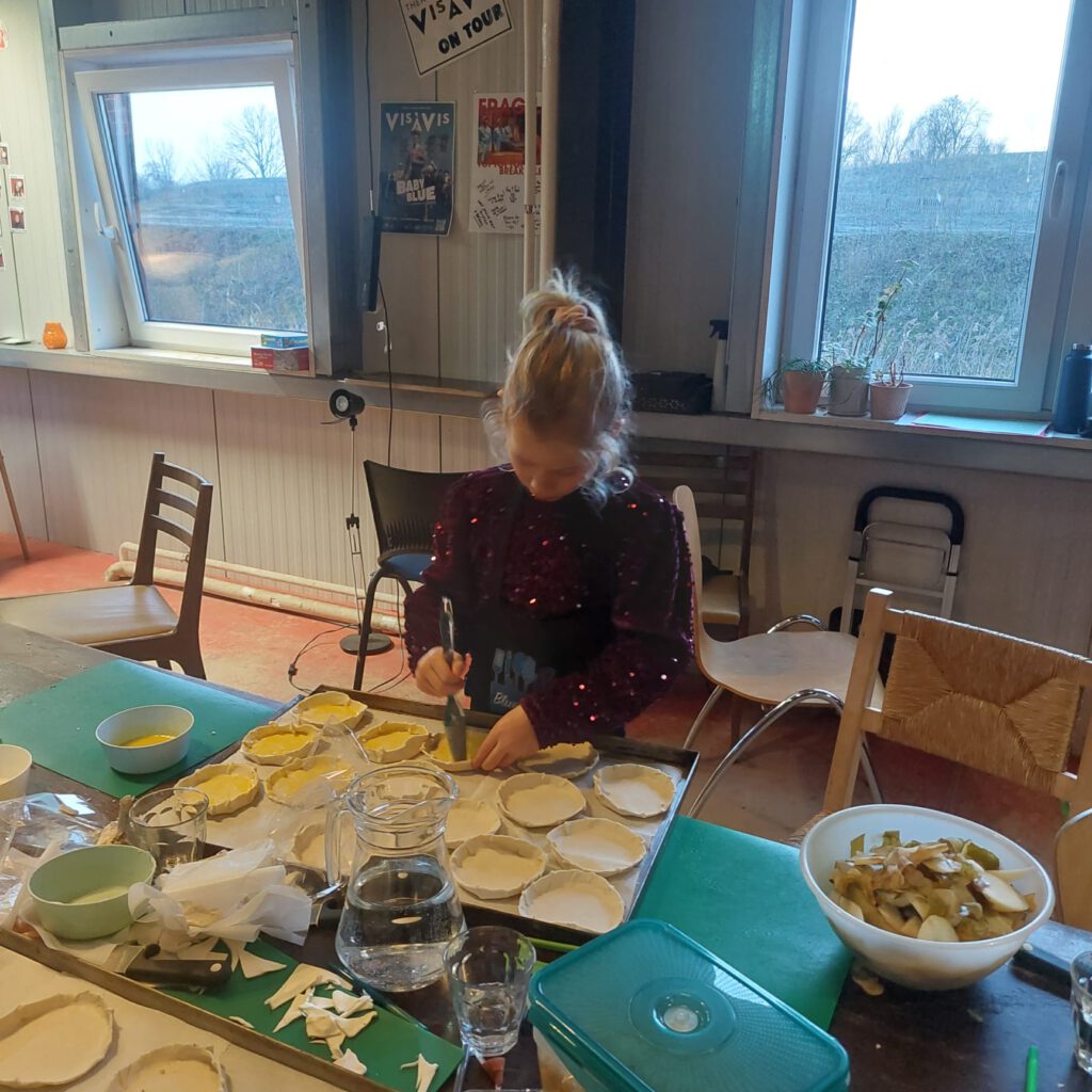 ‘Lotte is heel geconcentreerd aan haar taartvormpjes bezig, Amy en Sophie snijden de paddenstoelen”
